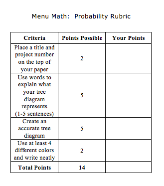 So I found a probability menu resource and decided to use it with my fifth grade crew. I added a rubric and a few other options to Yuliana’s template. Here is the template that I adapted and used for this project.