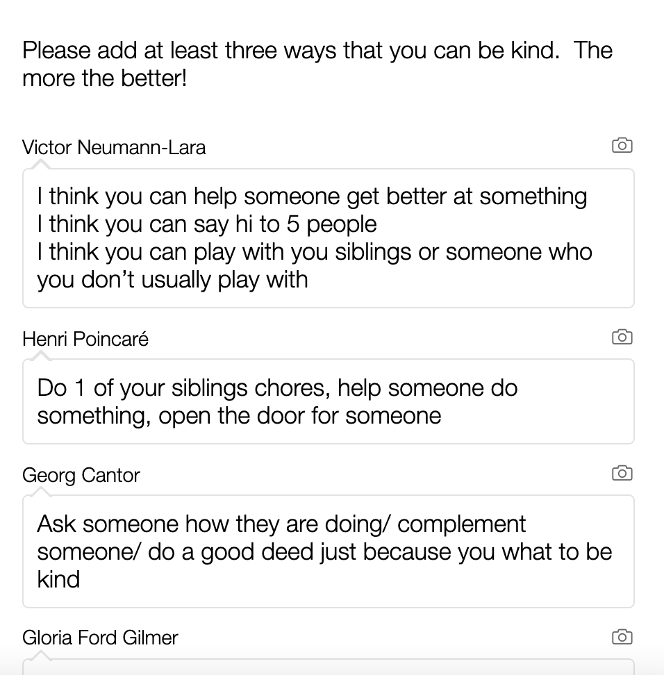 This week I tried something different to see the calendar’s relevancy and if it was something that I would like to keep for the remainder of the year. I used Desmos and asked students how they were kind for that week.