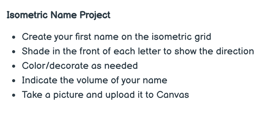 Before winter break 2021, my 3-5th grade students started an isometric name design project. I found this idea a few years ago on the bird app and was reminded after taking a look at Adrianne’s Desmos task. Since most students that I teach are in-person this year, I thought it’d be beneficial to expand on my geometry and measurement unit by having students explore the connections between math and art. To introduce the activity I showcased isometric art and grid work. Students were especially fascinated with optical illusions. Students were given directions.