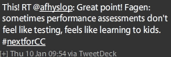 My assessment for learning belief stems from past experiences that weren’t so thrilling. I remember being given a graded test and then immediately moving on to the next topic of study. There wasn’t a review of the test or even feedback. A large letter grade (usually in a big red marker) was on the front and that was that. This left me salty. All teachers were students at some point and this memory has stuck with me.