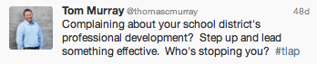 Despite the lackluster view on the process of PD in some locations, the group that I sat with agreed that there’s good news. The good news is that teachers aren’t depending on school districts to provide adequate PD. They’re seeking out their own PD and bringing back innovative ideas to the classroom. Teachers can bring these ideas to other connected educators around the world. Teachers are connecting with other educators across the world through Twitter and other social media avenues. This connection has many benefits. Being a connected educator often gives teachers opportunities to learn more from other educators and bring back practical ideas to the classroom. These teachers are using ideas found through their PLN to better their students’ learning experiences. Often times they are enhancing their students’ learning experience without the district even knowing. Districts need to be able to identify and celebrate theses succeses. I’m optimistic that school districts will adapt their current PD practices. My optimism is rooted in the fact school districts are listening to the staff and increasingly adopting non-traditional PD approaches to meet the professional needs of their teachers. These teachers are taking risks to better their own classroom/school and I believe school districts have the opportunity to do the same. I’m going to end this post with a Tweet that assisted in inspiring this post:
