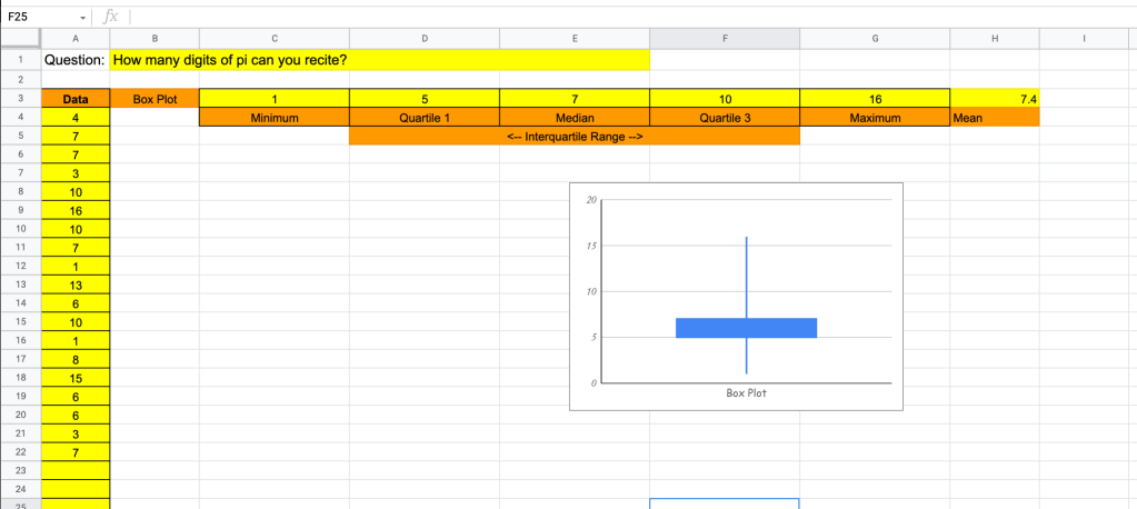 It was interesting to hear the conversations that students had as they compared the data to the box plot. The class had a discussion about interquartile range and variability. It was time well spent. From there, students shared their spreadsheets with me and I took a closer look to see how the data matched and if the correct formulas were in the appropriate places. Students seemed to grasp the concept fairly well. Feel free to use a copy of the spreadsheet by clicking here.