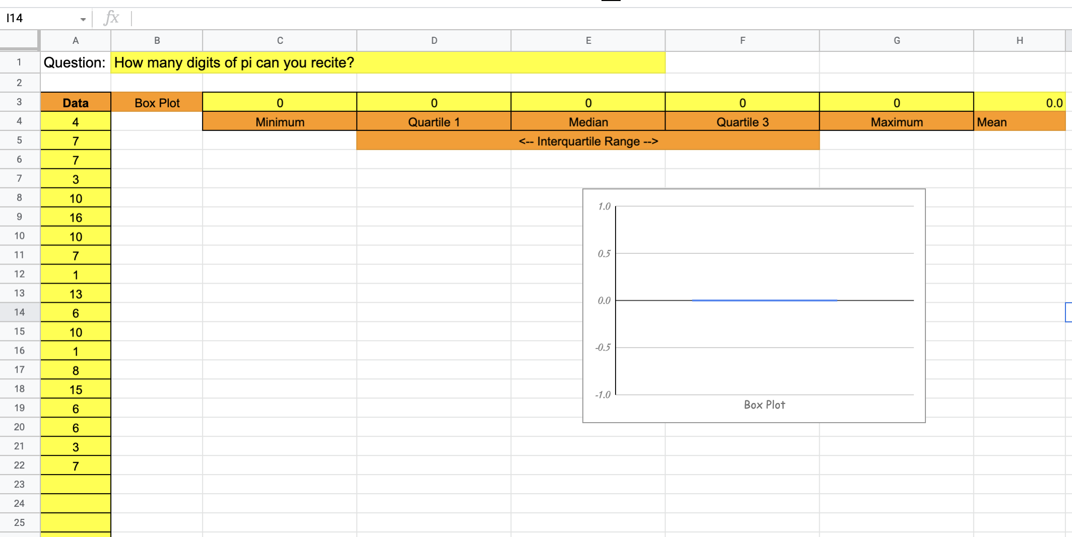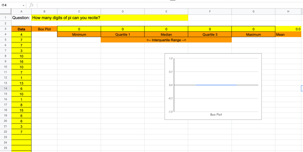 One of my classes has been exploring box plots and data landmarks lately. Earlier in the year the class created histograms and found data landmarks on line plots. Box plots was not as easy as a transition as anticipated. There were a few roadblocks as students analyzed and created their own box plots while determining Q1 and Q3. Some students picked up on the concept quickly while others took more time. To help reinforce the concept I thought about bringing in a spreadsheet activity. I have been using spreadsheets quite a bit this year and it has been another medium in which students can experience statistics.