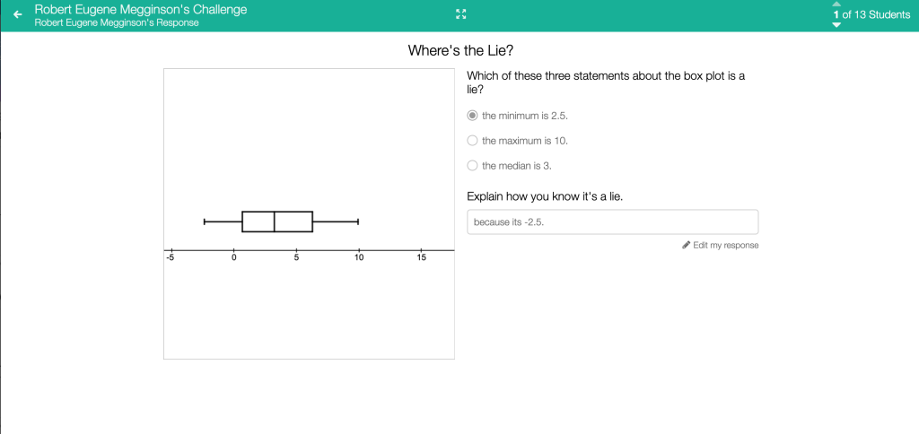During the next day the class reviewed box plots and the spreadsheets that were created earlier. Students then complete the Desmos task Two Truths and a Lie. This is one of my favorite tasks for students to discuss box plots and use math vocabulary while doing so.