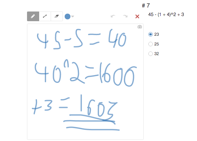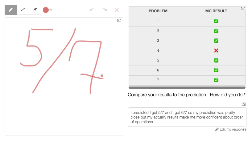 Once students finish the questions they visit a slide where they’re asked to reflect on the questions. They also draw on the sketch pad how they think they performed. During this time students revisit the questions in order to make an accurate prediction.
