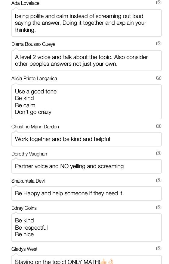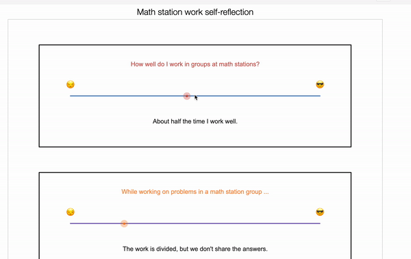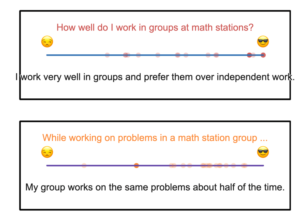 I ended up using Desmos to collect student information about the environment, attitudes and behaviors occurring during math station work. Students first started by self-reflecting on their beliefs during math stations and then rated their group’s actions.