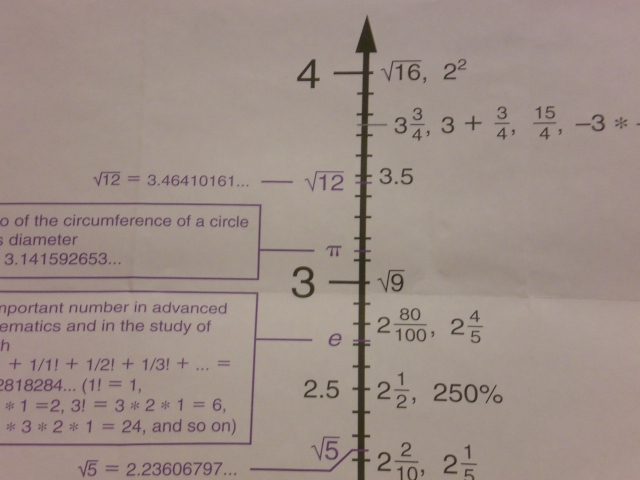 Recently I found a “Real Number Line” poster. I was fortunate enough to find this poster and have utilized it to teach elementary students about the number system. I think it’s important to communicate that square roots, fractions, percentages, mixed numbers, etc. should be included on a number line.